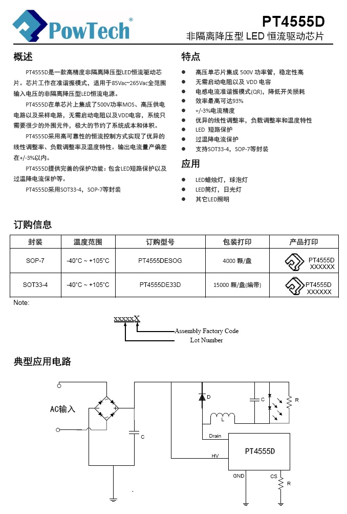 >>PT4555D-非隔离降压型LED恒流驱动芯片 双击自动滚屏