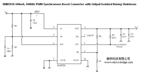 The EMH7020 is a high efficiency, synchronous fixed frequency, current-mode step-up DC/DC converter. During shutdown mode, the output is completely isolated from the input without drawing any battery current. The fixed 500KHz switching frequency obtains maximum efficiency up to 96% and uses only a few external components. With 180Ω loading, the minimum start-up voltage can be as low as 0.93V, provided by a one or two-cell alkaline or one-cell Li-Lon battery. The features of EMH7020 include current limit, low battery comparator, open-drain power good output, short circuit, and thermal shutdown protection. The EMH7020 is also available in 3X3mm TDFN-10 package.